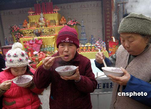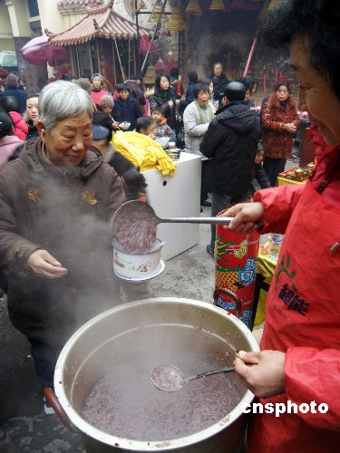 2009年1月3日,農(nóng)歷臘月初八,是中國傳統(tǒng)的臘八節(jié),湖北宜昌三峽古佛寺里準備了豐盛的臘八粥,眾多名市民在古佛寺里喜吃臘八粥。據(jù)悉,臘八粥又稱佛粥,與佛祖釋迦牟尼得道成佛有關(guān)。臘八粥在民間被視為吉祥食品,寓意一年之末的大豐收及來年風調(diào)雨順,吉祥如意。中新社發(fā) 劉君鳳 攝