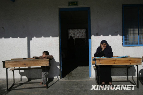 1月3日,在加沙地帶南部拉法,一名巴勒斯坦男孩(左)和家人臨時寄居在一個難民營的學(xué)校里。