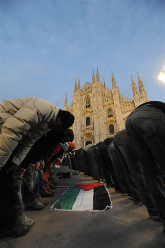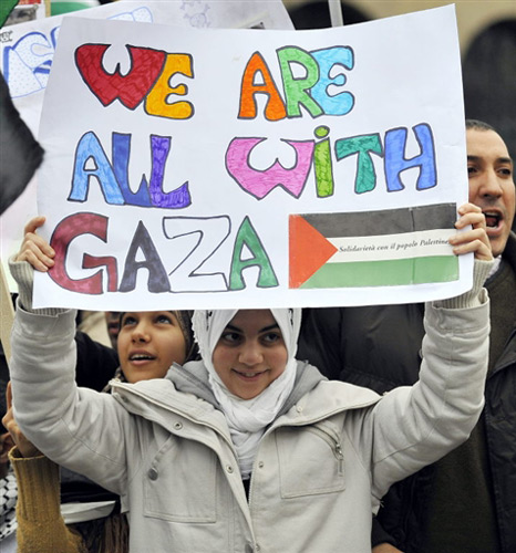1月3日,在意大利米蘭,當(dāng)?shù)厝罕娕e行集會(huì)活動(dòng),對(duì)在加沙地區(qū)遭空襲的巴勒斯坦死難者進(jìn)行祈禱,抗議以色列襲擊加沙。