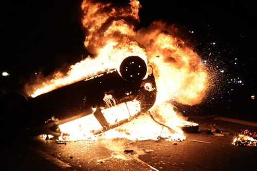 1月3日,在法國首都巴黎,一輛汽車在抗議以色列對加沙發(fā)動襲擊的示威集會中被點燃。