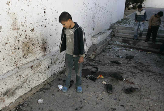 以色列部隊1月6日攻擊了加沙地區(qū)三處由聯(lián)合國設立的學校,造成數(shù)十名在學校內(nèi)逃避戰(zhàn)火的民眾喪生,另有百余人受傷。圖為巴勒斯坦兒童站在被以軍襲擊的聯(lián)合國學校外。