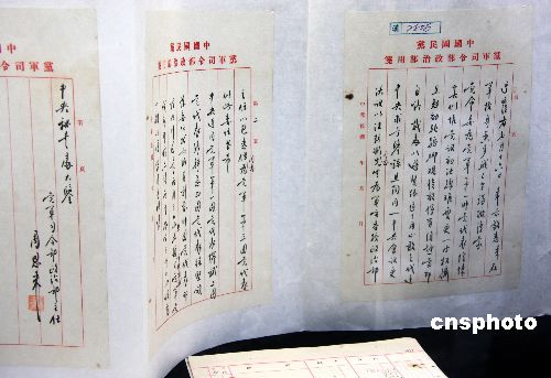 圖為周恩來擔(dān)任國(guó)民黨黨軍司令部政治部主任時(shí),于一九二五年七月致中央秘書處的函。中新社發(fā) 陳立宇 攝