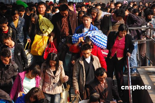 2009年1月10日,重慶北火車站迎來第一波春運客流高峰。由于外出務(wù)工人員提前返鄉(xiāng),各大高校開始放假,民工流和學(xué)生流融合,重慶火車站在春運前夕迎來了首個客流高峰,重慶市各大汽車站、火車站當(dāng)日都增開了加班車和臨客。2009年全國春運從1月11日開始,到2月19日結(jié)束,共計40天。中新社發(fā) 許康平 攝