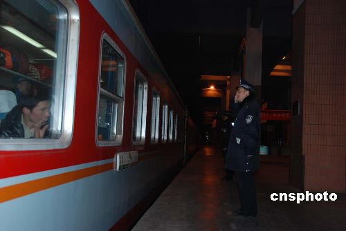 1月11日0點10分,杭州鐵路公安民警敬禮目送,杭州開往阜陽的春運第一車駛離火車站,標志著2009年杭州春運的正式開始。該趟列車共有17節(jié)車廂,共載有1800多人。由于是一趟臨時加班車,所以車身上依然掛的是上海到淮北的牌子。中新社發(fā) 姜越潮 攝