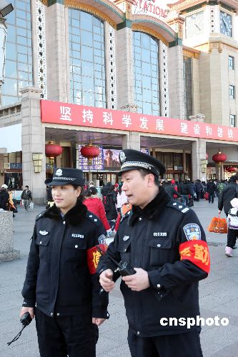 1月11日,2009年春運(yùn)正式開始,北京警方啟動(dòng)“服務(wù)旅客、平安春運(yùn)”活動(dòng),為旅客發(fā)放安全提示卡,張貼海報(bào)介紹購(gòu)票、乘車等出行注意事項(xiàng),確保市民度過(guò)一個(gè)安全、快樂(lè)的春節(jié)。中新社發(fā) 任海霞 攝
