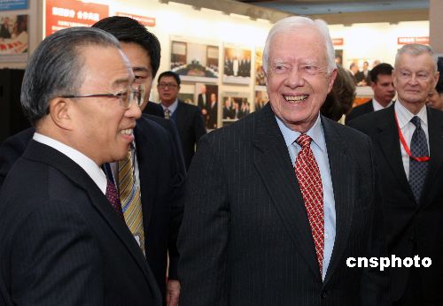 1月12日,中國(guó)國(guó)務(wù)委員戴秉國(guó)在北京陪同來(lái)訪的美國(guó)前總統(tǒng)吉米·卡特先生,參觀中美建交30周年圖片展覽,重溫兩國(guó)建交歷史。中新社發(fā) 宋吉河 攝