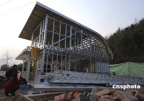 一座被四川災(zāi)民稱為“最牛的抗震房”春節(jié)前夕在地震受災(zāi)最重的北川縣永安鎮(zhèn)路邊崛起。這座由新加坡和成都合資公司建起的樣板房,采用新西蘭技術(shù),電腦設(shè)計,國產(chǎn)合金材料和抗壓裂建材,三室一廳兩層式,同類房屋已經(jīng)在泰國、伊朗和印尼災(zāi)區(qū)重建的廉價屋區(qū)廣泛應(yīng)用。中新社發(fā) 賈國榮 攝