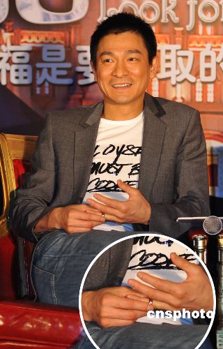 1月13日,由華誼兄弟出品、劉偉強執(zhí)導(dǎo)的浪漫愛情大片《游龍戲鳳》舉行官網(wǎng)啟動儀式。劉德華出席活動時左手無名指驚現(xiàn)環(huán)形戒指,他在接受訪問時還不停的玩撫戒指,多次摘掉又戴上。中新社發(fā) 李學(xué)仕 攝