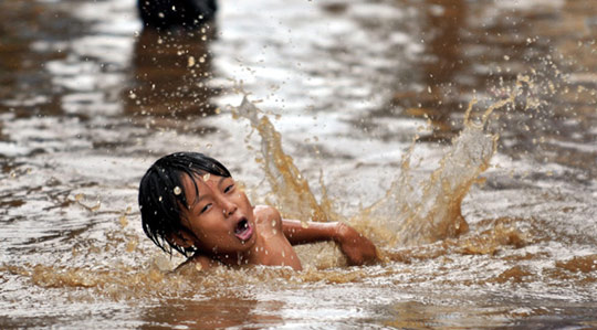 1月14日,在印度尼西亞首都雅加達(dá)市中心,一名男孩在暴雨過(guò)后被水淹沒(méi)的街道上游泳。