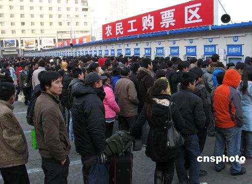 1月15日,北京西站廣場(chǎng)春運(yùn)農(nóng)民工售票窗口前,成千旅客提前多天排隊(duì)購(gòu)買返鄉(xiāng)列車票,購(gòu)票秩序良好。北京西站迎來春運(yùn)“農(nóng)民工返鄉(xiāng)流、學(xué)生流、探親流”的客流高峰,預(yù)計(jì)春運(yùn)期間每天到發(fā)旅客列車約280多列,客流高峰時(shí)可達(dá)20萬人次,平均每五分鐘發(fā)一趟列車。中新社發(fā) 鄒憲 攝