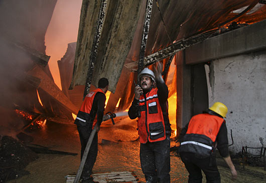 1月15日,巴勒斯坦消防人員為遭以軍炮擊后起火的聯(lián)合國駐加沙的辦公機構(gòu)滅火。