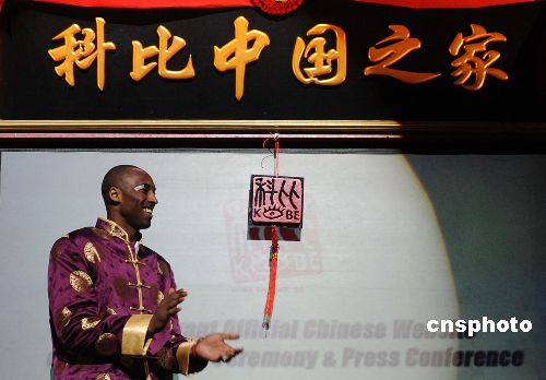 當(dāng)?shù)貢r(shí)間一月十五日,美國(guó)NBA巨星科比·布萊恩特中文官方網(wǎng)站“科比中國(guó)之家”在洛杉磯正式開(kāi)通,身著唐裝的科比親自參與并親自開(kāi)通網(wǎng)站。中新社發(fā) 張煒 攝