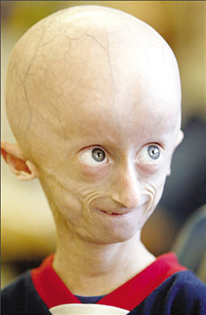 據(jù)報道,現(xiàn)年14歲的美國男孩塞斯·庫克是美國華盛頓州西雅圖附近達令頓地區(qū)人,和《返老還童》中的男主人公本杰明一樣,他出生時就沒有毛發(fā),皮下脂肪退化,皮膚血管清晰可見,如同一名70歲老人一般衰老。當塞斯18個月大時,他被診斷出患有罕見的早衰癥。37歲的父親凱爾·庫克說:“一開始我們聽到這個消息簡直驚呆了,我們不敢相信這一切。”
