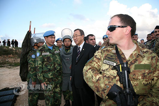 黎巴嫩當(dāng)?shù)貢r間17日,正在中東進(jìn)行外交斡旋的聯(lián)合國秘書長潘基文在視察聯(lián)合國駐黎巴嫩維和部隊時,專程前往藍(lán)線接見了中國赴黎維和工兵營掃雷官兵。