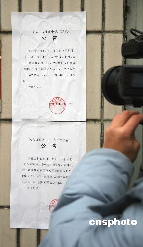 圖為法院門口張貼關(guān)于下午兩點(diǎn)開庭宣判三鹿集團(tuán)及田文華等生產(chǎn)、銷售偽劣產(chǎn)品一案和張玉軍、張彥章以危險方法危害公共安全案的公告。中新社發(fā) 翟羽佳 攝