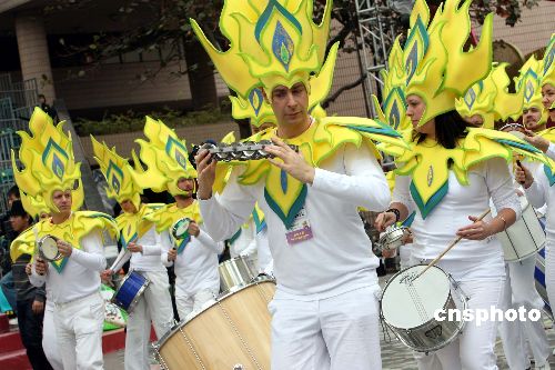 一月二十五日,前來香港參加新春國際匯演之夜的多支隊伍在文化中心廣場進行彩排,丹麥桑巴舞演員身穿華麗舞衣,配合熱情奔放的音樂,點燃現(xiàn)場歡樂氣氛。由香港旅發(fā)局主辦的“2009國泰航空新春國際匯演之夜”將在大年初一晚舉行。中新社發(fā) 洪少葵 攝