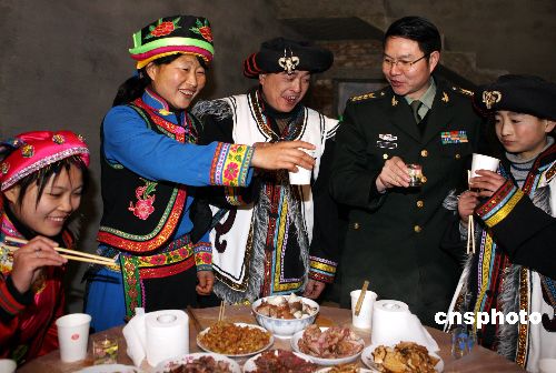 1月25日農(nóng)歷除夕,在5·12大地震中房倒屋塌的四川省北川縣擂鼓鎮(zhèn)茨溝村羌族農(nóng)民張?jiān)?中),特邀在地震發(fā)生后帶領(lǐng)解放軍成都軍區(qū)某集團(tuán)軍駐川高炮旅官兵率先趕到、將其一家和全村民眾救出險(xiǎn)境的該旅政委先衛(wèi)平(右二)和部隊(duì)官兵在新建的住房?jī)?nèi)共吃團(tuán)圓飯。中新社發(fā) 任晨鳴 攝
