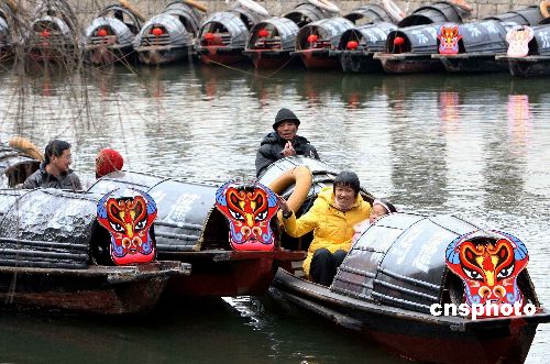 1月25日下午,浙江紹興東湖景區(qū)的烏篷船掛上牛頭圖,喜迎牛年到來。中新社發(fā) 袁云 攝