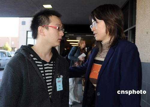 當(dāng)?shù)貢r(shí)間一月三十一日下午,中國(guó)駐洛杉磯副總領(lǐng)事黃曉健(右)在內(nèi)華達(dá)大學(xué)醫(yī)療中心和中國(guó)游客小洪(左)交談。小洪是沒(méi)有參加大峽谷一日游而躲過(guò)一劫的五名中國(guó)游客之一,而小洪的父母受傷嚴(yán)重,尤其是母親傷勢(shì)危重。中國(guó)游客當(dāng)?shù)貢r(shí)間一月三十日下午在美國(guó)亞利桑那州的九十三號(hào)公路上遭遇嚴(yán)重車禍,造成七人遇難、十人受傷。中新社發(fā) 張煒 攝