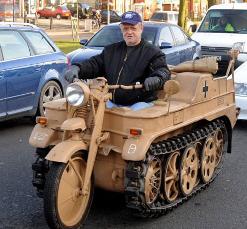 中新網(wǎng)2月2日電 據(jù)英國(guó)媒體報(bào)道,一位52歲的英國(guó)男子提姆·哈耶斯是夜班卡車司機(jī),四年前在網(wǎng)上購買了一輛德國(guó)二戰(zhàn)半履帶式坦克裝甲摩托車,去年在車子到手后,提姆白天一有空便在大街上飆坦克車解悶,放松自我。