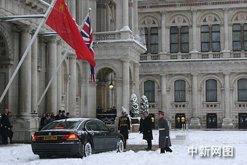 倫敦當(dāng)?shù)貢r(shí)間二月二日上午八時(shí)三十分許,正在這里進(jìn)行正式訪問的中國總理溫家寶前往英國外交部,出席布朗首相舉行的歡迎儀式。圖為溫家寶座車駛向觀禮臺,英國首相布朗(右二)在車旁迎接。 中新社記者 張朔 攝