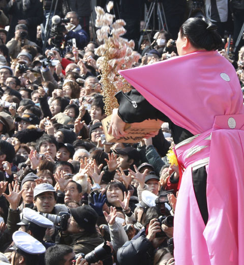 2月3日,在日本靜岡縣熱海市舉行了“撒豆子”儀式,炒熟的黃豆在日本被稱為“福豆”,儀式主辦方請(qǐng)來(lái)名人站在高處,將炒熟的黃豆拋向人群,以驅(qū)邪迎福,祈愿身體健康。
