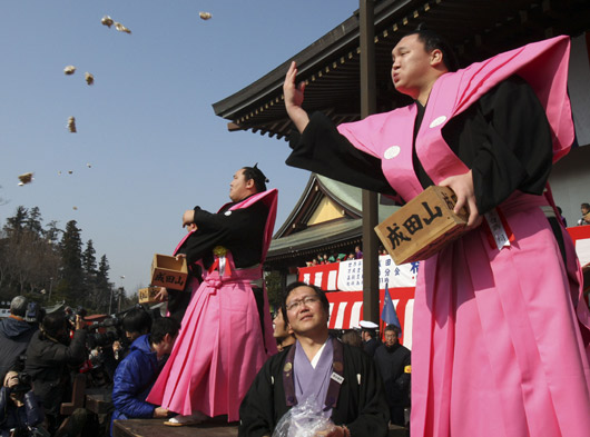 2月3日,在日本靜岡縣熱海市舉行了“撒豆子”儀式,炒熟的黃豆在日本被稱為“福豆”,儀式主辦方請來名人站在高處,將炒熟的黃豆拋向人群,以驅(qū)邪迎福,祈愿身體健康。