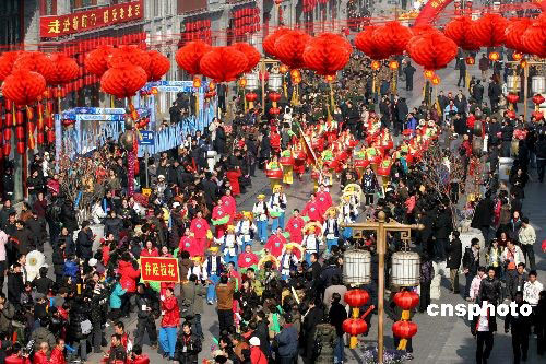 2月9日上午,來自北京、河北、山東等3個省市的12支花會隊,在前門大街舉行“傳統(tǒng)民間花會踩街”活動,喜迎正月十五元宵節(jié)的到來。踩街是一種中國傳統(tǒng)民間民俗藝術(shù)表演形式,類似國外的花車游行,表演隊伍邊行進邊表演,游客沿途觀看。花會隊從正陽門箭樓南側(cè)和前門五牌樓出發(fā),16只南獅和北獅為大隊人馬開道,隨后中幡、旱船、二魁摔跤、地秧歌、鼓子秧歌等將依次向珠市口行進。