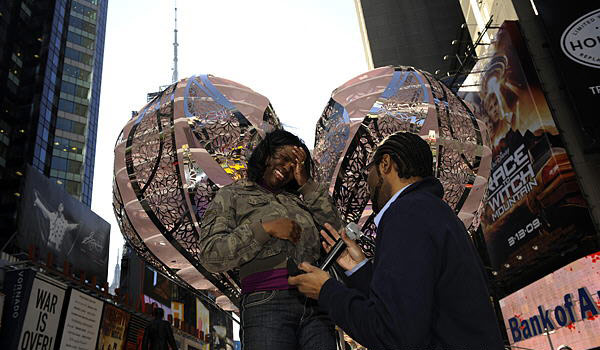一位男子在美國紐約時報廣場的心型雕塑前為他的妻子唱歌表達愛意。