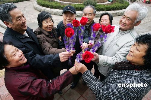 在山東濰坊市奎文區(qū)后門街社區(qū),一對(duì)對(duì)老年夫婦收到玫瑰花后喜笑顏開(kāi)。在情人節(jié)來(lái)臨前,該社區(qū)開(kāi)展了“執(zhí)子之手、與子偕老”活動(dòng),社區(qū)的老年夫妻互相送上了象征愛(ài)情的玫瑰花。中新社發(fā) 張馳 攝