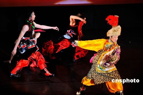 當(dāng)?shù)貢r(shí)間二月十三日晚,“四海同春”藝術(shù)團(tuán)在硅谷庫(kù)柏蒂諾市佛林特中心劇場(chǎng)上演《快樂(lè)藏人》。這是藝術(shù)團(tuán)在美國(guó)訪問(wèn)的最后一站。中新社發(fā) 陳鋼 攝