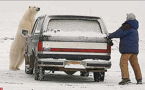 美國阿拉斯加州一名男子在大雪天駕車出行時,不慎遇到一只強壯的北極熊。這只北極熊饑餓難耐,想拿這名男子當(dāng)“晚餐”,于是北極熊和這名男子在雪地里繞著車展開一場“貓捉老鼠”的驚險游戲。最終男子成功擺脫了北極熊的追逐,死里逃生。
