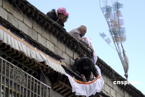 2月24日,中國(guó)藏歷年三十,西藏拉薩八角街的居民在更換屋檐上的仙布,以迎接藏歷新年的到來(lái)。中新社發(fā) 廖攀 攝