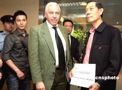 圖為香港海員工會主席郭錦華船長(右一)向俄羅斯駐港領(lǐng)事館工作人員遞交抗議書。中新社發(fā) 張勤 攝