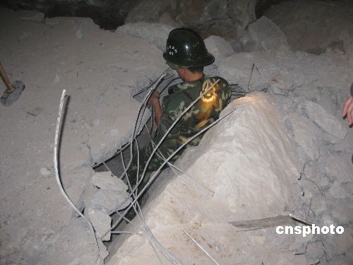 圖為都安縣消防官兵鉆入廢墟進行搜救。中新社發(fā) 蘭寶喜 攝