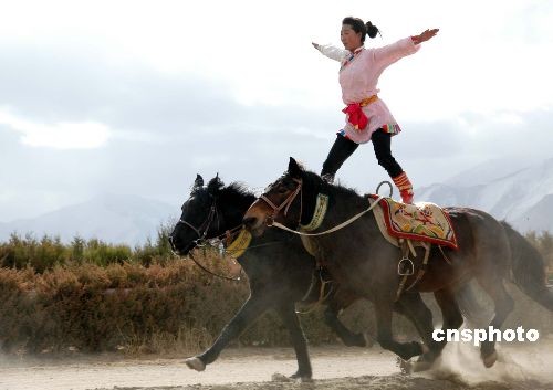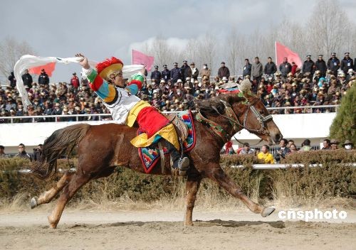 2月27日,中國藏歷年初三,在拉薩市北郊的賽馬場,傳統(tǒng)賽馬與馬術(shù)表演活動隆重舉行,身懷絕技的騎手們?yōu)槌汕先f的觀眾表演了精彩絕倫各種節(jié)目。中新社發(fā) 周波 攝