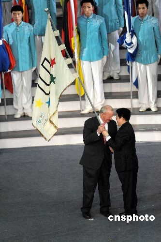 哈爾濱市市長張效廉把大冬會會旗交給國際大體聯(lián)主席喬治·基里安。