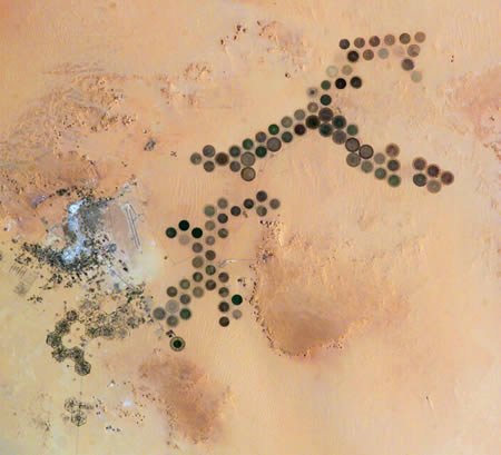 亞沙漠灌溉農(nóng)業(yè)區(qū):圖中沙漠中的綠色圓圈代表中央管道灌溉農(nóng)業(yè)地帶。