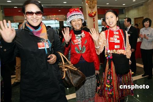 3月1日下午,參加全國政協(xié)十一屆二次會(huì)議的全國政協(xié)委員開始陸續(xù)抵京。圖為來自云南的少數(shù)民族委員在駐地受到工作人員的熱烈歡迎。中新社發(fā) 傅丹丹 攝
