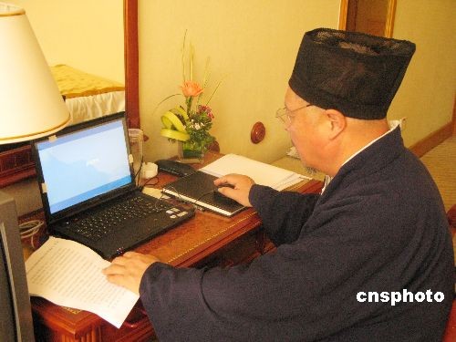 全國(guó)政協(xié)十一屆二次會(huì)議開(kāi)幕前夕,中國(guó)道教協(xié)會(huì)副會(huì)長(zhǎng)劉懷元在所住酒店房間內(nèi)用電腦起草提案。中新社發(fā) 張子揚(yáng) 攝