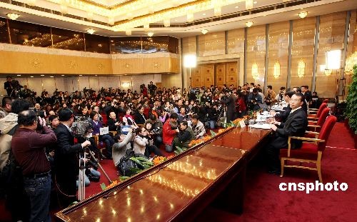 3月2日,全國政協(xié)十一屆二次會(huì)議新聞發(fā)布會(huì)在北京人民大會(huì)堂舉行,全國政協(xié)外事委員會(huì)主任、全國政協(xié)大會(huì)發(fā)言人趙啟正介紹會(huì)議情況,吸引大批中外記者到場(chǎng)。中新社發(fā) 傅丹丹 攝