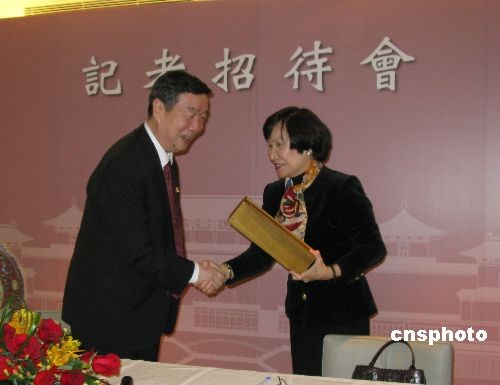 圖為北京故宮博物院院長(zhǎng)鄭欣淼(左)向臺(tái)北故宮博物院院長(zhǎng)周功鑫(右)贈(zèng)送宋代趙昌《寫(xiě)生蛺蝶圖》的高仿復(fù)制品。中新社發(fā) 路梅 攝