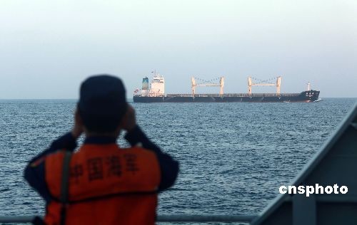中國海軍護(hù)航編隊(duì)“海口”號(hào)導(dǎo)彈驅(qū)逐艦完成接護(hù)遭海盜襲擊商船“雁蕩!碧(hào)任務(wù)。圖為2月26日,接護(hù)途中護(hù)航官兵對(duì)商船進(jìn)行了望、警戒。2月25日,“雁蕩海”號(hào)由于供貨期限原因未能參加護(hù)航,在亞丁灣海域航行途中遭遇海盜襲擊。中新社發(fā) 孫自法 攝