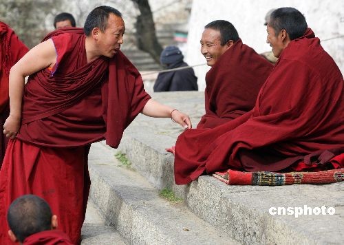 3月4日,藏歷新年正月初八,拉薩色拉寺舉行傳昭大法會,僧人們會進行傳統(tǒng)的辯經、祈愿、頌經等佛事活動。每年的傳昭大法會從藏歷正月初八開始,持續(xù)到藏歷正月十五。圖為在色拉寺大殿前舉行的僧人辯經活動。中新社發(fā) 劉震 攝