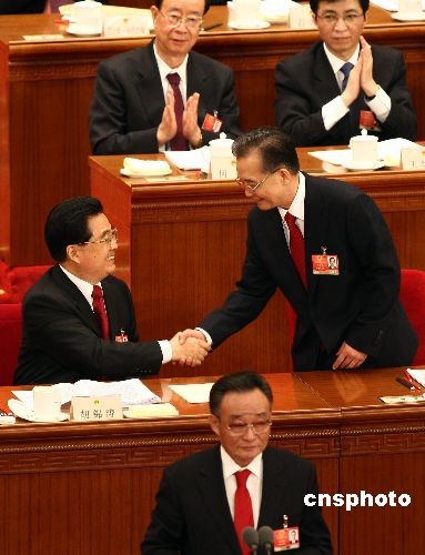 3月5日上午,十一屆全國人大二次會議在北京人民大會堂開幕,國務(wù)院總理溫家寶作《政府工作報(bào)告》后,與國家主席胡錦濤握手。中新社發(fā) 杜洋 攝