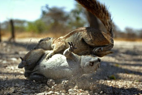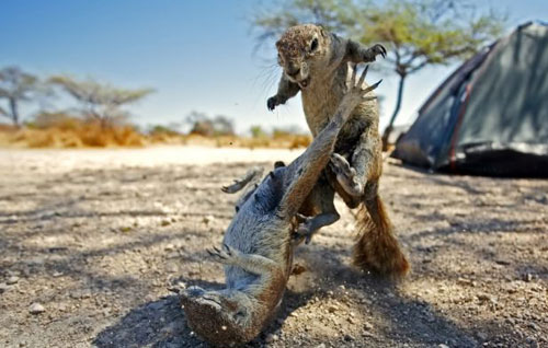 松鼠“耍功夫”。一名叫大衛(wèi)·斯萊特的英國攝影師在納米比亞的埃托沙國家公園拍到了幾只南非地松鼠搏斗的場景。照片拍攝于納米比亞的埃托沙國家公園,一只南非地松鼠正在“教訓(xùn)”一位“入侵者”。對(duì)手倒在地上,這只地松鼠毫不猶豫地用它毛茸茸的腿一陣狂踢,以保護(hù)自己領(lǐng)地不受侵犯。
