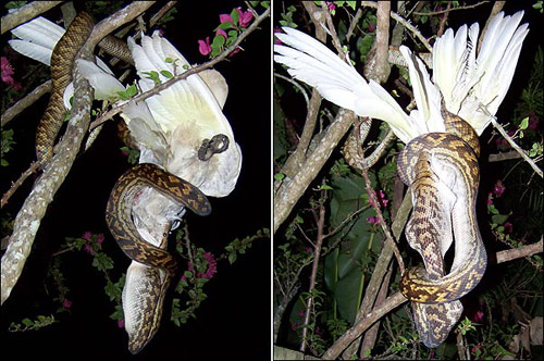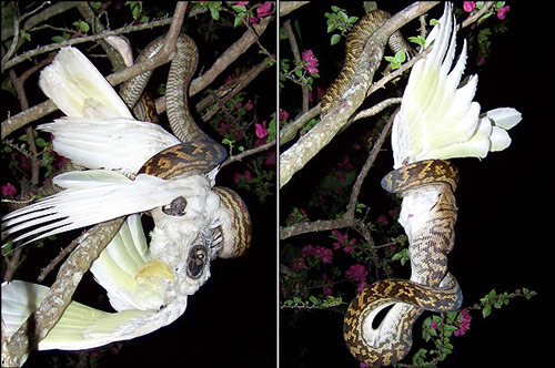 蟒蛇吞食鸚鵡。英國一名女子拍攝到了一條蟒蛇吞吃一只美冠鸚鵡的全過程。事情發(fā)生在英國凱恩斯克利夫頓海灘一戶人家的院子內,當時一條蟒蛇纏繞在一顆大樹的樹枝上,忽然間它發(fā)現了美味的獵物——一只美冠鸚鵡。這條蟒蛇緩慢地爬過去,猛地撲向鸚鵡,將鸚鵡死死纏住,直到鸚鵡窒息后,慢慢地將其吞下去。