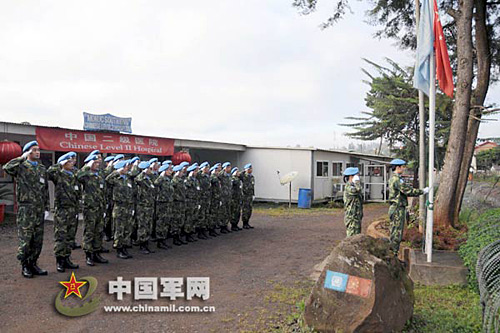中國第九批赴剛果(金)維和醫(yī)療分隊舉行升國旗儀式,紀念三八國際婦女節(jié)。武國強 攝