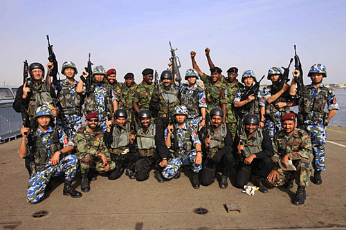 中國海軍特戰(zhàn)隊員、巴基斯坦海軍特戰(zhàn)隊員和尼日利亞海軍特戰(zhàn)隊員在海上直升機滑降演習現場合影。查春明 攝