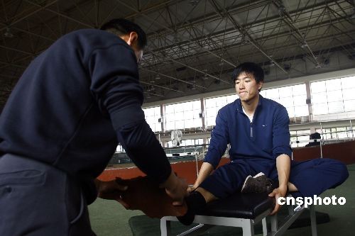 3月10日上午, 劉翔在上海莘莊基地開始進行正式訓(xùn)練,在訓(xùn)練間隙,孫海平教練用一塊海綿來幫助訓(xùn)練劉翔右腳的靈敏性。孫海平教練表示:由于劉翔的傷勢剛剛恢復(fù),右腳踝關(guān)節(jié)力量還不夠,用海綿訓(xùn)練是為了增加劉翔右腳踝的靈活性!敝行律绨l(fā) 湯彥俊 攝